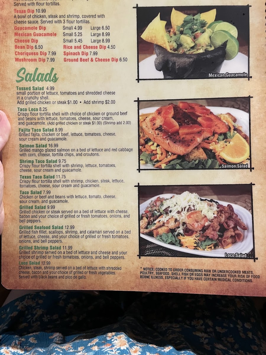 Grilled Fajita Chicken or Steak served on a bed of lettuce with Tomatoes, Onions, Bell Peppers, Shredded Cheese, & Bacon bits